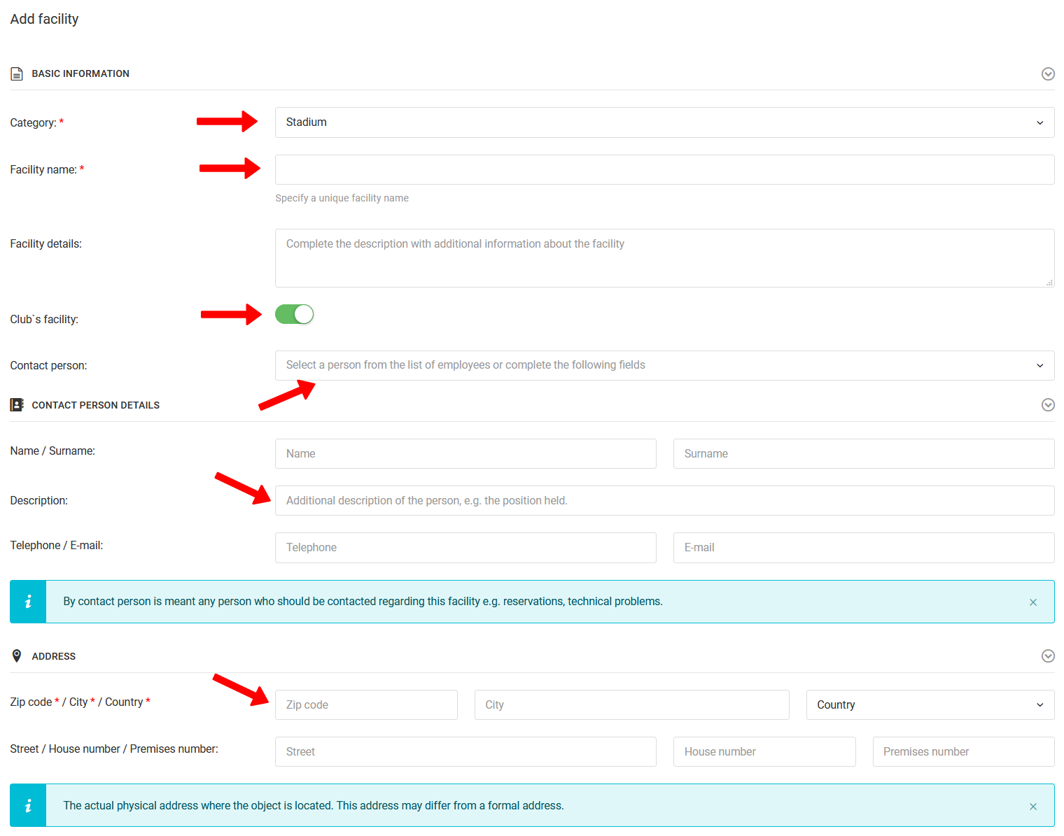 In the form you have some important fields to complete. The first one is to choose the type of facility. You can choose between stadium, training centre, school, etc. The next field to be completed is the facility name and description. Then specify whether the facility belongs to the club if you have to select a contact person if not, enter the details of the facility owner and contact person. In the last step, complete the full, exact address of the facility you are entering into the system.