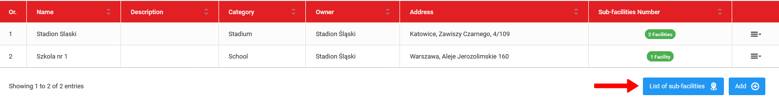 To add a sub facility to the parent facility, go to the list of sub facilities and click the blue "add" button. You can add as many sub facilities as you like in a given facility. Remember that it is from among the sub-objects that you will choose the location when adding a training session or a match.