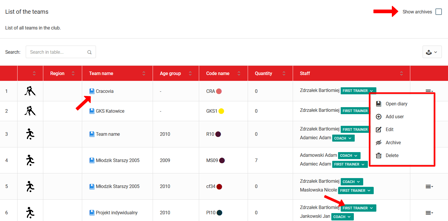 If a team has already finished training in your club (oldest year), but you still want to keep their archived data, select "archive" from the menu. You will be able to return to the historical data of this team at any time by checking the "show archive" box in the upper right corner. To permanent delete a team from the system, you should remove all coaches from it in the first step. Then select the "delete" option from the menu of the team. The topic of adding teams has already been mentioned in previous chapters of this guide.