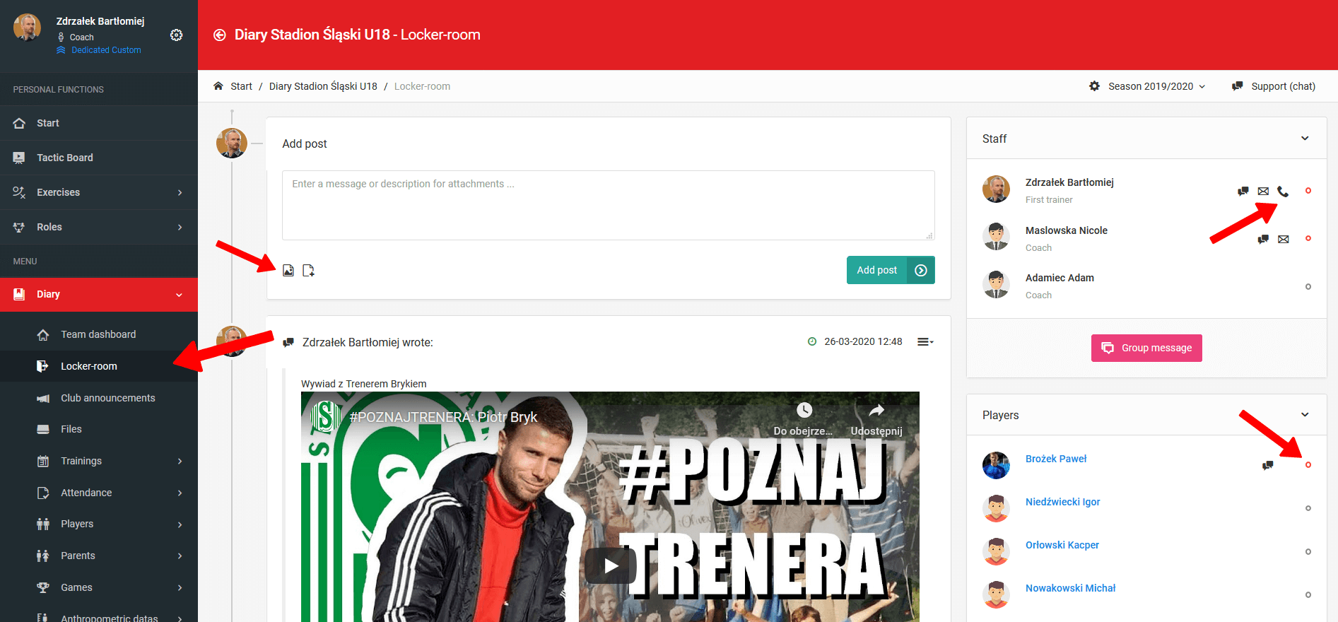 Svlačionica i ploča funkcioniraju kao zatvorena korisnička grupa u kojoj možete dijeliti datoteke, videozapise, fotografije ili poveznice. Štoviše, ovdje možete započeti grupni razgovor s odabranim korisnicima, kao i privatni razgovor s jednim imenovanim trenerom. Svlačionica i ploča dostupni su i putem mobilne aplikacije, a svaka objava koju dodate generira push obavijest za određene korisnike.