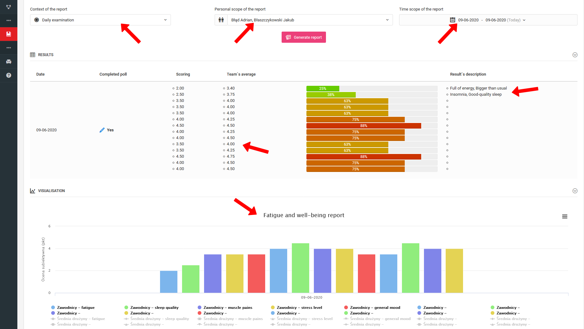 Rezultati predstavljeni u izvješćima pružaju vam analizu pojedinačnih, po svakom mjerenju (dan, trening, utakmica) i skupnih izjava u obliku grafikona koji prikupljaju podatke na jednoj vremenskoj traci. Štoviše, analiza će pokazati postotak promjene rezultata u odnosu na posljednju anketu i dominantan odgovor među igračima.
