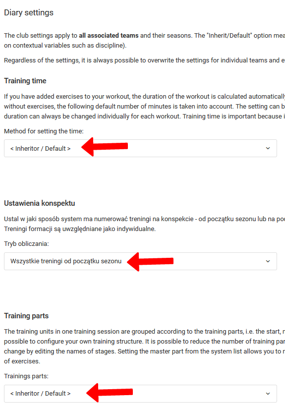 დღიურის პარამეტრებზე გადასასვლელად, გადადით კლუბი პარამეტრები დღიურის პარამეტრები. დღიურის პარამეტრებს შორის, რომლებიც შეგიძლიათ დააყენოთ ნაგულისხმევად, არის: ვარჯიშის ნაგულისხმევი დრო, ვარჯიშის სტრუქტურა (ვარჯიშის ნაწილები მონახაზზე), მატჩის პარამეტრები (მოთამაშეების ნაგულისხმევი რაოდენობა და ხანგრძლივობა) და მატჩის წინა ოქმის პარამეტრები (ნომრები მაისურებზე და საწვრთნელი პერსონალი, რომელიც ჩანს მსაჯის ოქმზე).