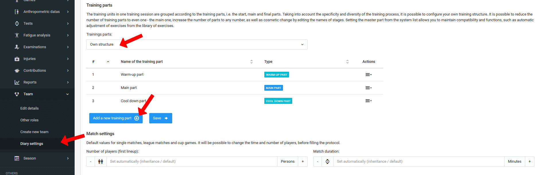 სისტემა გაძლევთ საშუალებას შექმნათ საკუთარი გეგმის სტრუქტურა. ნაგულისხმევად, გეგმაში არის ვარჯიშის სამი ნაწილი: საწყისი, მთავარი და საბოლოო ნაწილები. ამ ფუნქციით შეგიძლიათ დააყენოთ ვარჯიშის ნაწილების ნებისმიერი რაოდენობა და თანმიმდევრობა. ნაწილების დაყენება შესაძლებელია კლუბის დონიდან და შემდეგ მემკვიდრეობით გადაეცემა გუნდებს ან შეიქმნას ინდივიდუალურად კონკრეტული გუნდისთვის. თქვენი საკუთარი გეგმის სტრუქტურის დაყენება შეგიძლიათ ჩანართში დღიური გუნდი დღიურის პარამეტრები.