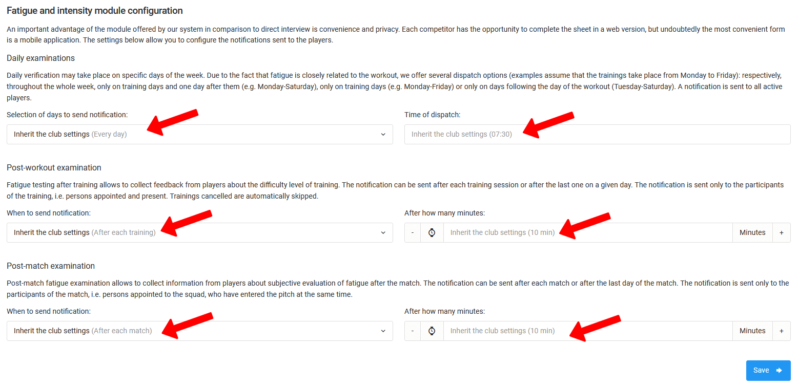 Paziņojumu konfigurācija balstās uz trīs to veidiem. Ikdienas aptaujas gadījumā jums ir šādas iespējas dienu izvēles laukā, kad spēlētājam tiks paziņots: izslēgts, katru dienu, treniņu dienās + dienu pēc, tikai treniņu dienās vai tikai dienās pēc treniņa. Pēcspēles un pēctreniņa noguruma analīzei jums ir divas iespējas nosūtīt paziņojumu: pēc katras spēles/treniņa vai pēc pēdējās dienas spēles/treniņa. Turklāt jums jāiestata paziņojuma laiks (ikdienas tests) un laiks minūtēs pēc treniņa/spēles. Pēc datu aizpildīšanas visos laukos noklikšķiniet uz zilās pogas "saglabāt".