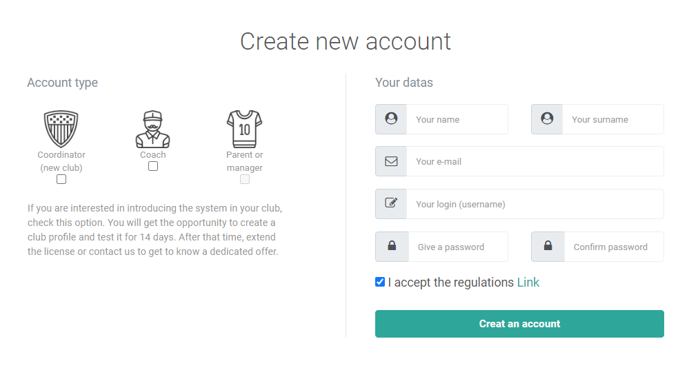 Lai izveidotu kontu ProTrainUp, ievadiet savā pārlūkprogrammā protrainup.com. Pēc tam augšējā izvēlnē noklikšķiniet uz pogas "reģistrācija". Tad izvēlieties konta veidu, kuru vēlaties izveidot. Jūs varat izvēlēties individuālo trenera kontu vai kluba licenci. Vecāku un spēlētāju kontus vienmēr izveido treneri vai koordinatori.