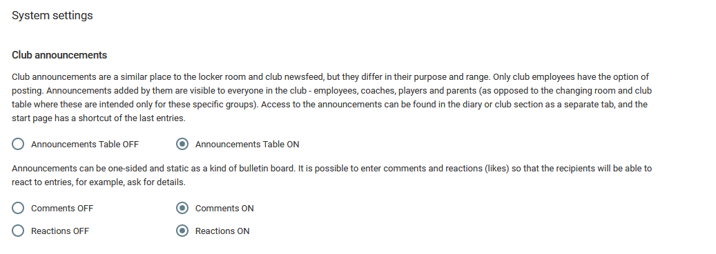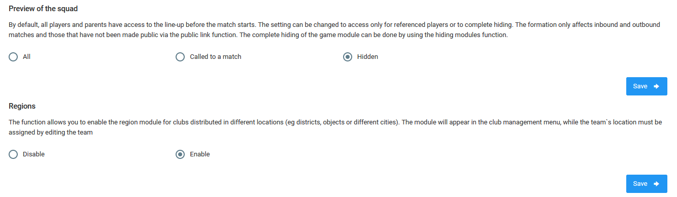 Šeit jūs pārvaldāt redzamību: cilnes paziņojumiem, spēles sastāva priekšskatījumus, reģionu cilnes un to, vai lietotājs varēs atstāt reakcijas un komentārus zem ieraksta ziņojumu dēlī un ģērbtuvē. Šeit jūs arī konfigurējat automātiskos DotPay maksājumus, bet par to mēs jau runājām iepriekšējās nodaļās.