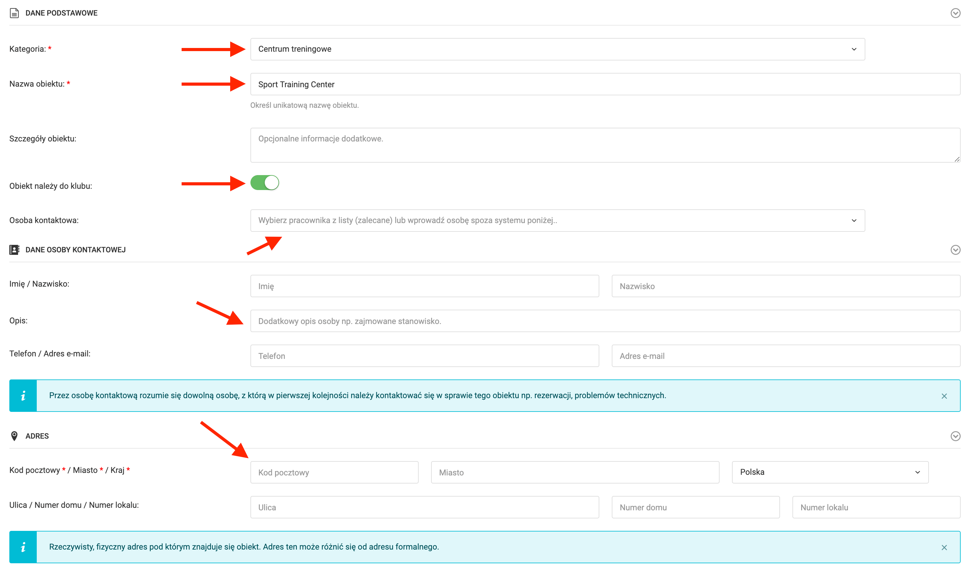 W formularzu masz do uzupełnienia kilka istotnych pól, z czego obowiązkowe oznaczone zostały symbolem gwiazdki. Pierwsze z nich to wybór typu obiektu. Do wyboru masz m.in. stadion, centrum treningowe, szkoła, itd. Kolejnymi polami do uzupełnienia jest nazwa obiektu oraz opcjonalny opis. Następnie określ czy obiekt należy do klubu, jeżeli tak wybierz osobę kontaktową jeżeli nie, podaj dane właściciela obiektu i osoby kontaktowej. W ostatnim kroku uzupełnij adres pod którym znajduje się obiekt, minimum to dane ogólne (miasto i kod pocztowy), ale zalecany jest pełny adres dzięki czemu będziemy mogli wyświetlić dokładniejsze wskazówki dojazdu.