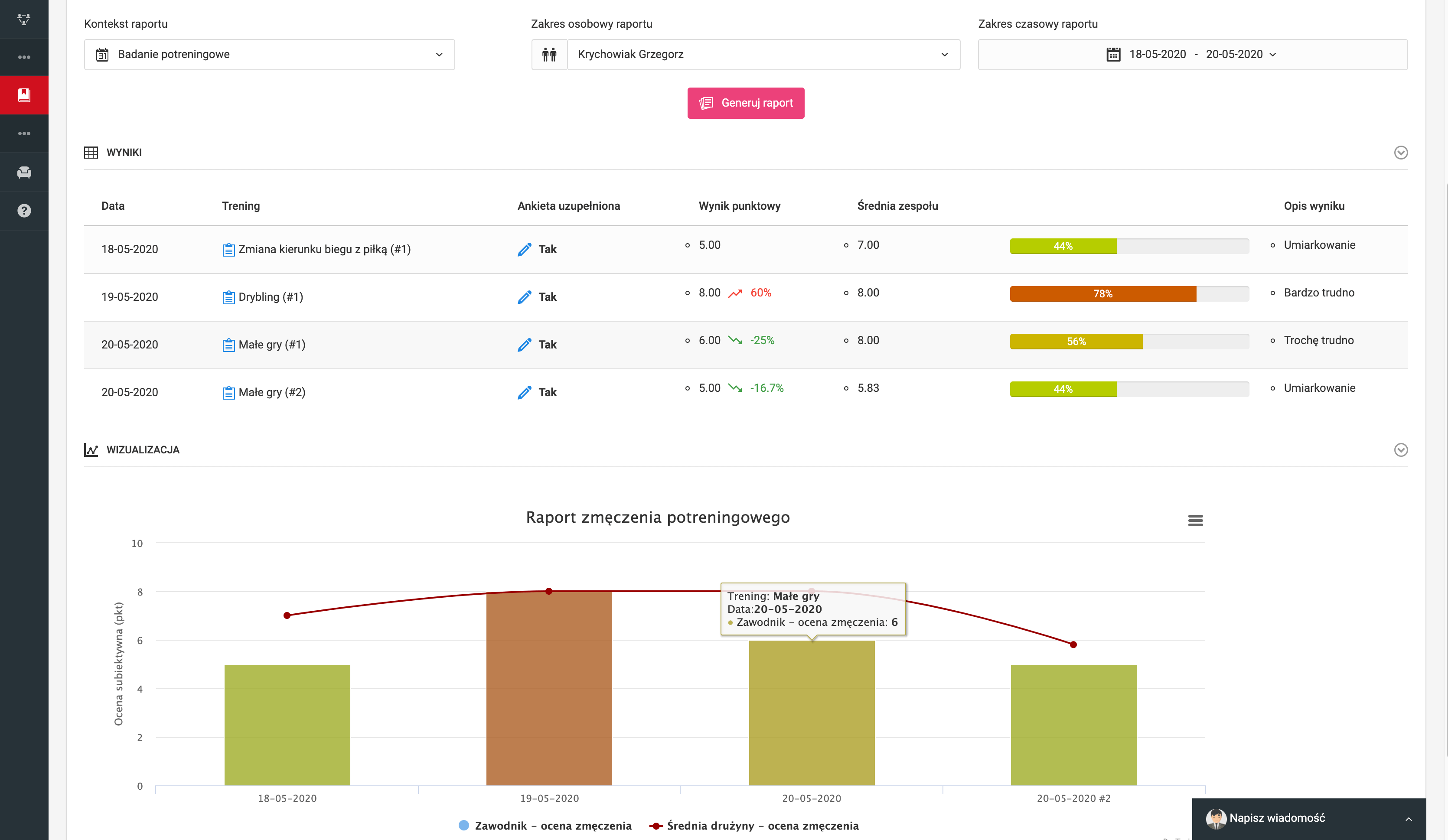 System posiada rozbudowany moduł raportów i analiz związanych z oceną subiektywnego samopoczucia i zmęczenia zawodników. Aby przejść do raportów i analiz kliknij w lewym menu w dziennik analiza zmęczenia raporty.