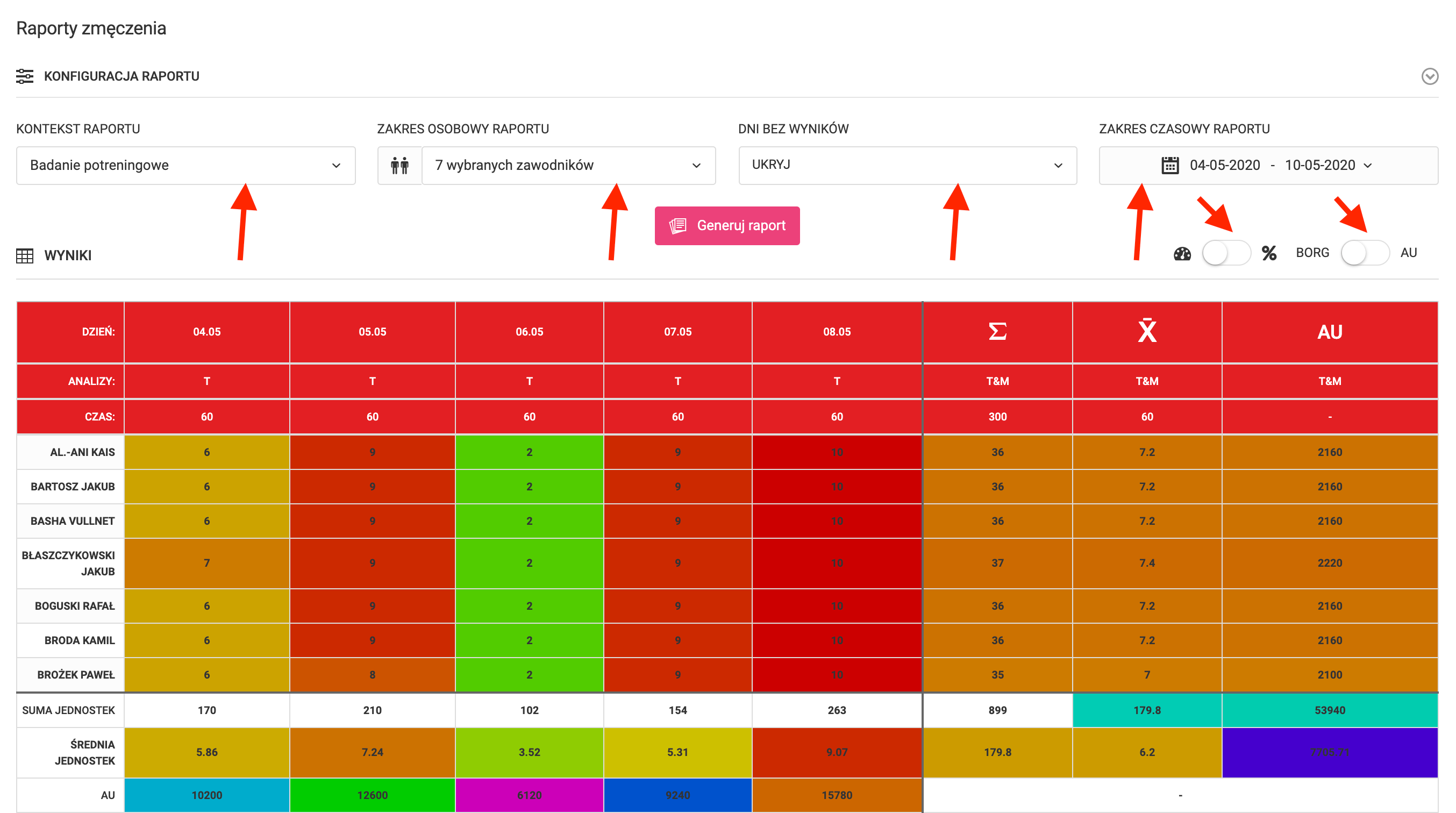 Po prawej stronie nad tabelą  masz dwa suwaki, które wpływają na sposób prezentacji danych. Pierwszy z nich odpowiedzialny jest za zmianę sposoby obliczania wyników - do wyboru masz wartość liczbową lub procentową. W drugim suwaku ustalasz czy dane mają być przedstawione w formie wartości określonej skali lub jako obliczone jednostki zmęczeniowe (AU).