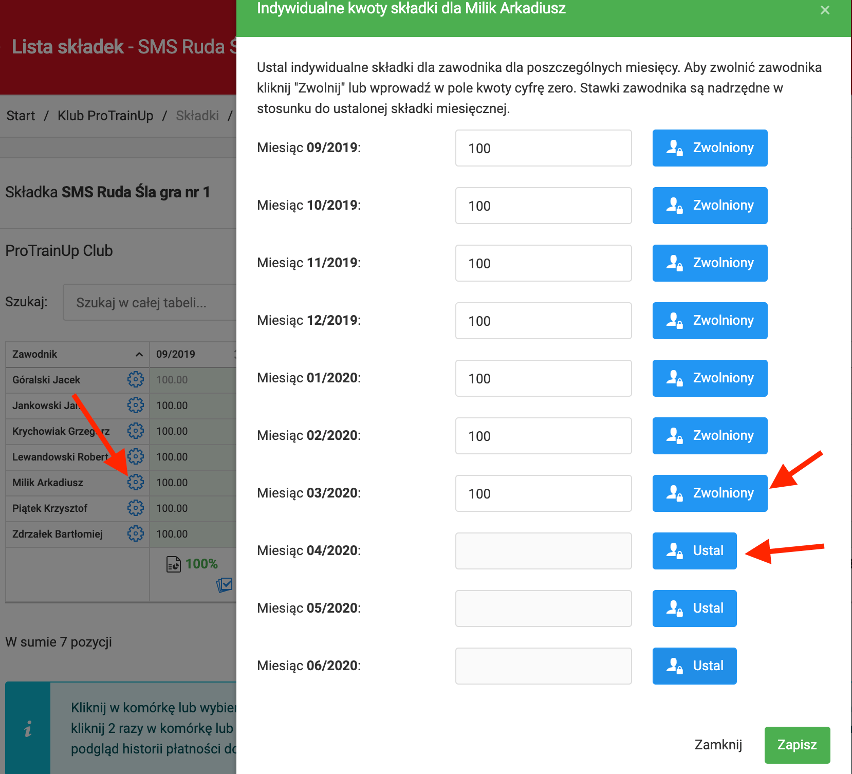 Jak widzisz na obrazku, w oknie ustalania indywidualnej kwoty składki, masz możliwość zwolnienia ze składki, w tym przypadki zawodnik zwolniony jest od kwietnia do czerwca ze składki, jak i również możliwość wpisania kwoty składki w pola tekstowe przy każdym z miesięcy. Po wpisaniu odpowiednich kwot lub zwolnienia zawodnika ze składki, pamiętaj aby zapisać formularz, naciskając zielony przycisk "zapisz".