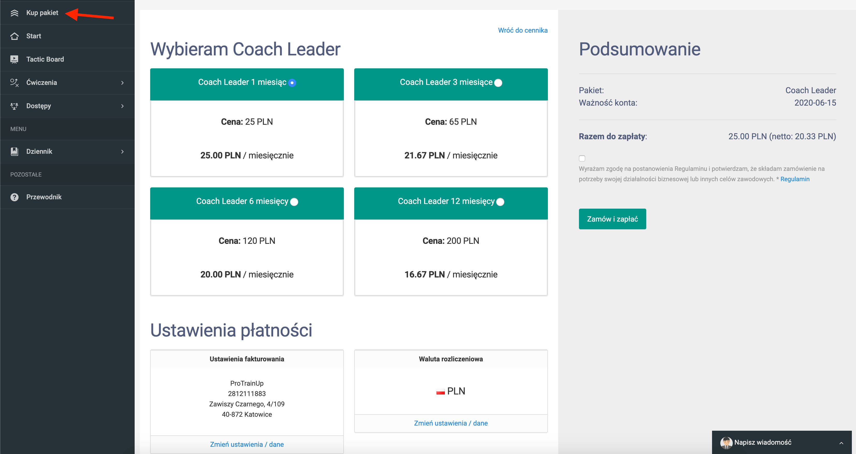 Przed zakupem licencji, możesz śmiało korzystać z naszego bezpłatnego konta Coach Free. Więcej na temat licencji dowiesz się na stronie z cennikiem. Jeżeli zdecydujesz się kupić licencję indywidualną, musisz posiadać konto trenera. Po zalogowaniu się do systemu wybierz z lewego menu opcje "kup pakiet". Wybierz interesujący Cie pakiet oraz czas jego ważności. Jeżeli potrzebujesz faktury, uzupełnij niezbędne do tego celu dane i przejdź do płatności. Opłata wykonywana jest poprzez system szybkich płatności Przelewy24. Twoja licencja będzie aktywna od razu po zaksięgowaniu przez nas Twojego przelewu.