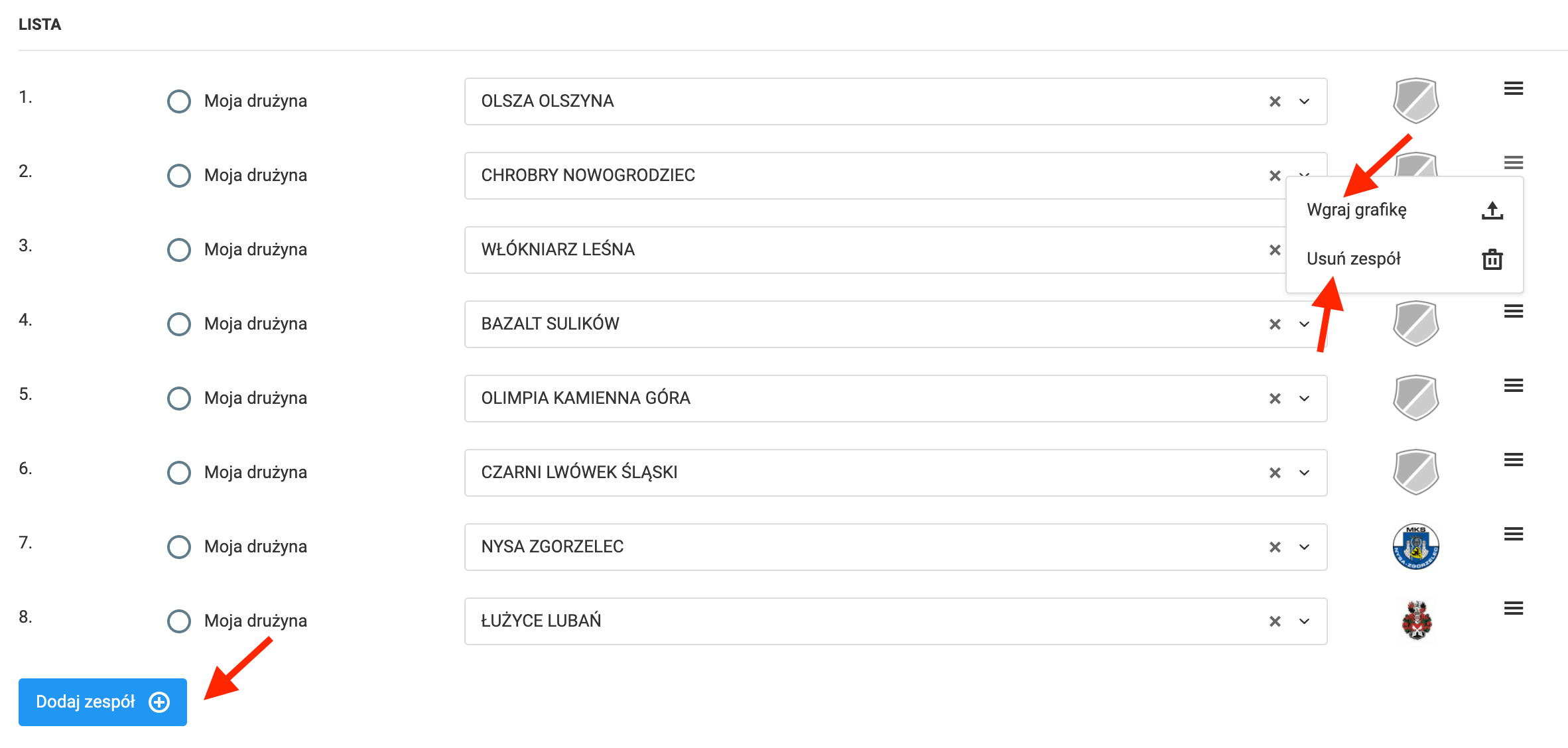 Po wprowadzeniu podstawowych danych na temat rozgrywek czas na kolejny krok, będzie to uzupełnienie zestawienia drużyn biorących udział w rozgrywkach. Poza wpisaniem nazw zespołów będziesz mógł także dodać ich herby. W tym też oknie w przypadku edycji rozgrywek, będziesz mógł usunąć lub dodać zespół do listy drużyn biorących udział w rozgrywkach.