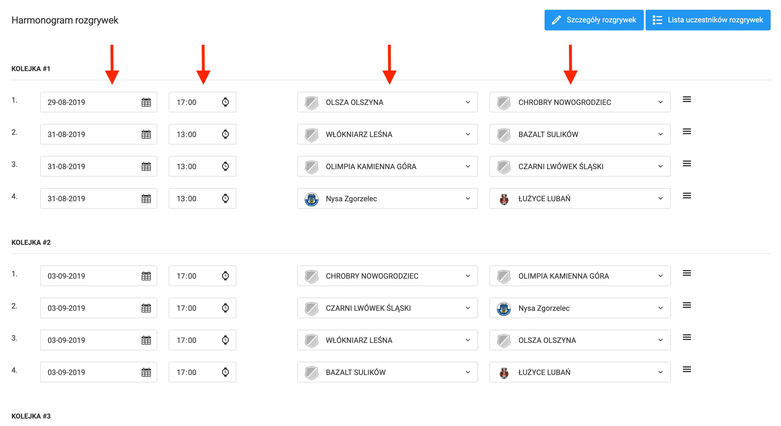 Ostatnim etapem tworzenia rozgrywek jest rozpisanie par meczowych, w każdej kolejce rozgrywek. Możesz zrobić to za jednym razem lub rozłożyć to sobie na etapy. Do ustalenia masz cztery elementy: datę, godzinę, gospodarza oraz zespół gości każdego meczu. Ustalanie uczestników meczu jest o tyle wygodne, że raz wybrany zespół nie może być wybrany kolejny raz w ramach jednej kolejki spotkań. Dzięki temu unikniesz pomyłki podczas układania terminarza spotkań.