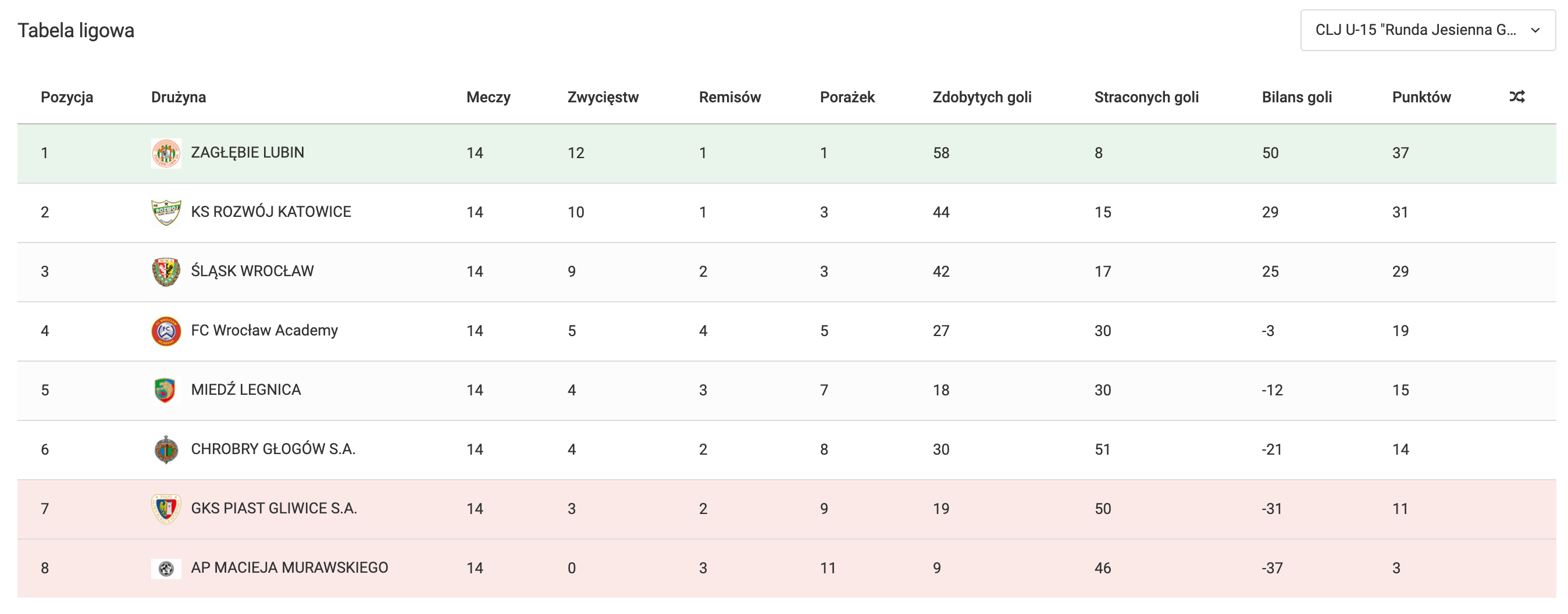 Na podstawie parametrów rozgrywek oraz wyników meczów wprowadzanych do systemu, automatycznie generowana jest tabela ligowa poszczególnych rozgrywek.