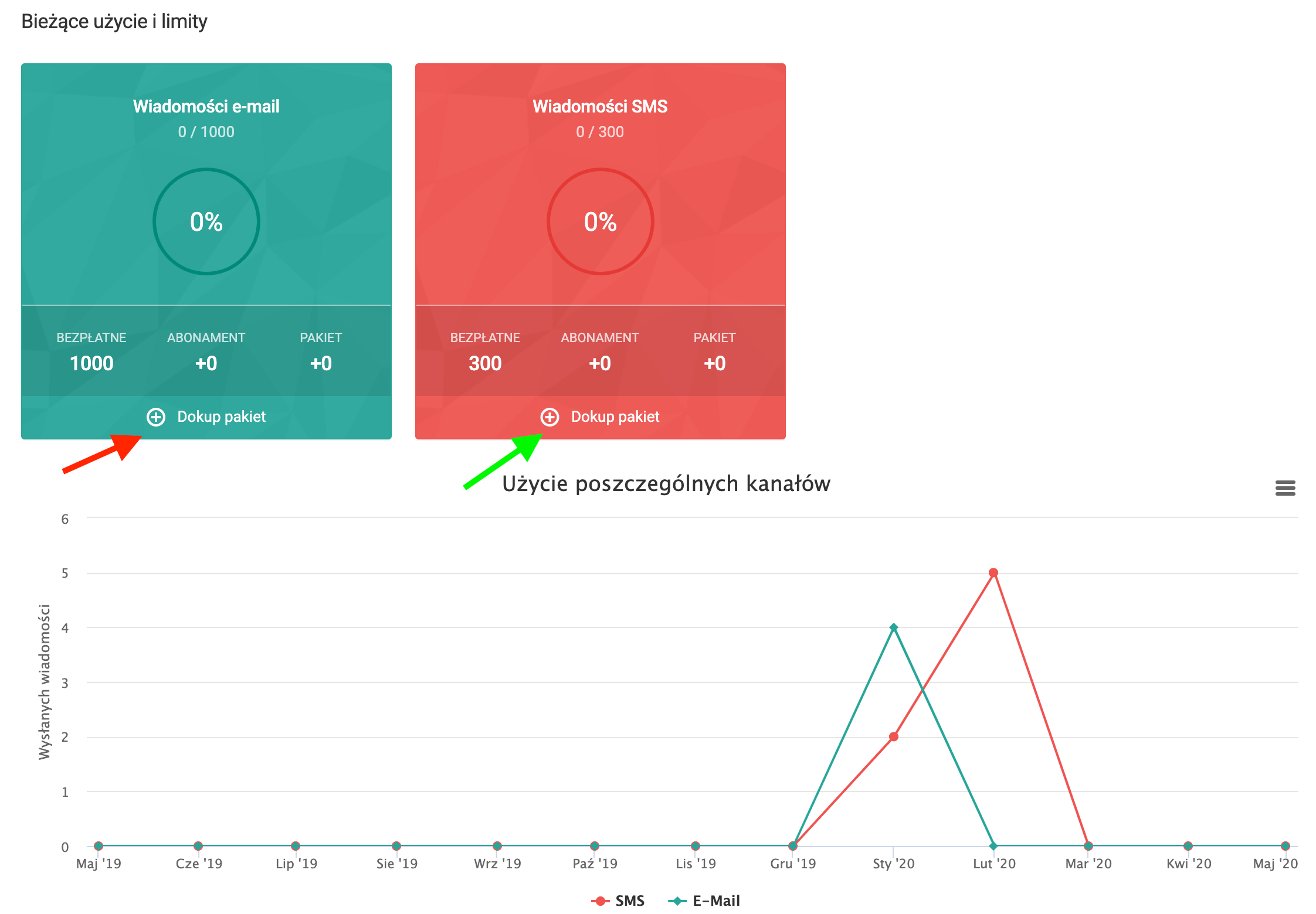 W tym także miejscu możesz sprawdzić aktualne statystyki dotyczące zużycia pakietów. Aby kupić dodatkowy pakiet sms czy email, kliknij we wskazany na rysunku przycisk "dokup pakiet". Po kliknięciu zostaniesz przeniesiony na stronę zakupu pakietów wiadomości. Pamiętaj, że każdy zakupiony pakiet jest ważny do ostatniego dnia miesiąca! Niewykorzystany pakiet nie przechodzi na kolejny miesiąc!