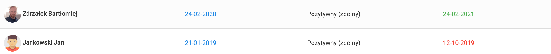 Aby wejść w listę badań wybierz z lewego menu dziennik badania lista badań. Otworzy Ci się zbiorcza tabela wszystkich przeprowadzonych w danej drużynie badań. Na zielono oznaczone są badania aktualne, natomiast na czerwono badania, których termin ważności już upłynął.