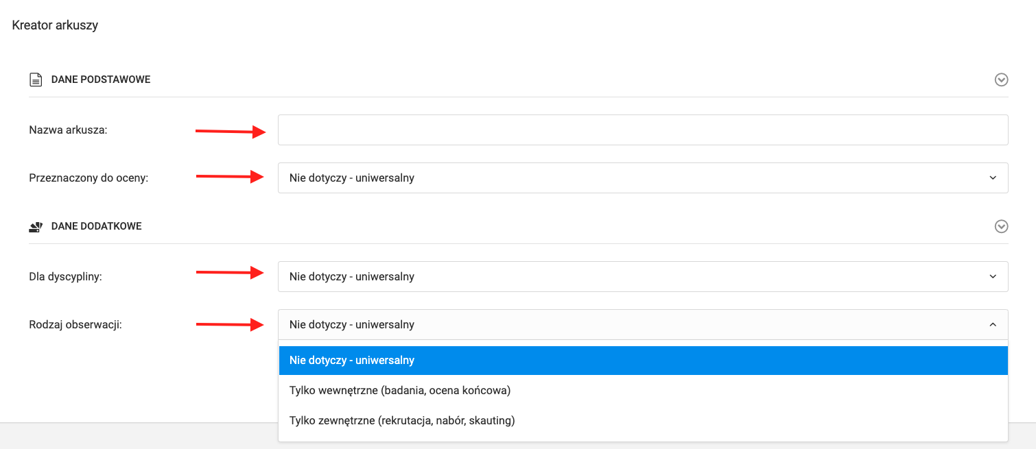 Aby przejść do tworzenia arkusza oceny wybierz z lewego menu zakładkę klub oceny i obserwacje arkusze kreator arkuszy. Pierwszym krokiem utworzenia nowego arkusza oceny jest podanie jego nazwy. Następnie wybierz typ użytkownika, którego ten arkusz ma dotyczyć. Do wyboru jest arkusz uniwersalny, dla zawodników, trenerów lub pracowników klubu. Następnym elementem do zdefiniowania jest dyscyplina sportu, dla której przygotowywany jest arkusz. Ostatnią kwestią do określenia jest rodzaj obserwacji czy oceny, do której arkusz będzie wykorzystywany.
