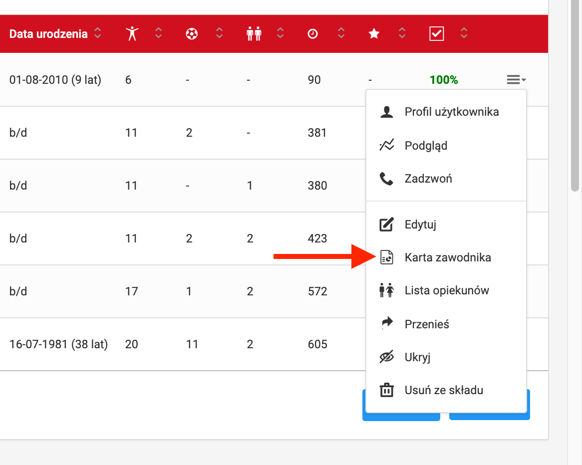 Aby przejść do karty zawodnika, ponownie wchodzisz na listę zawodników, następnie wybierasz z menu w ostatniej kolumnie tabeli, pozycję "karta zawodnika". Po kliknięciu zostaniesz przeniesiony na stronę karty zawodnika, gdzie znajdziesz szereg zestawień dotyczących osiągnięć zawodnika na przestrzeni ostatniego sezonu.