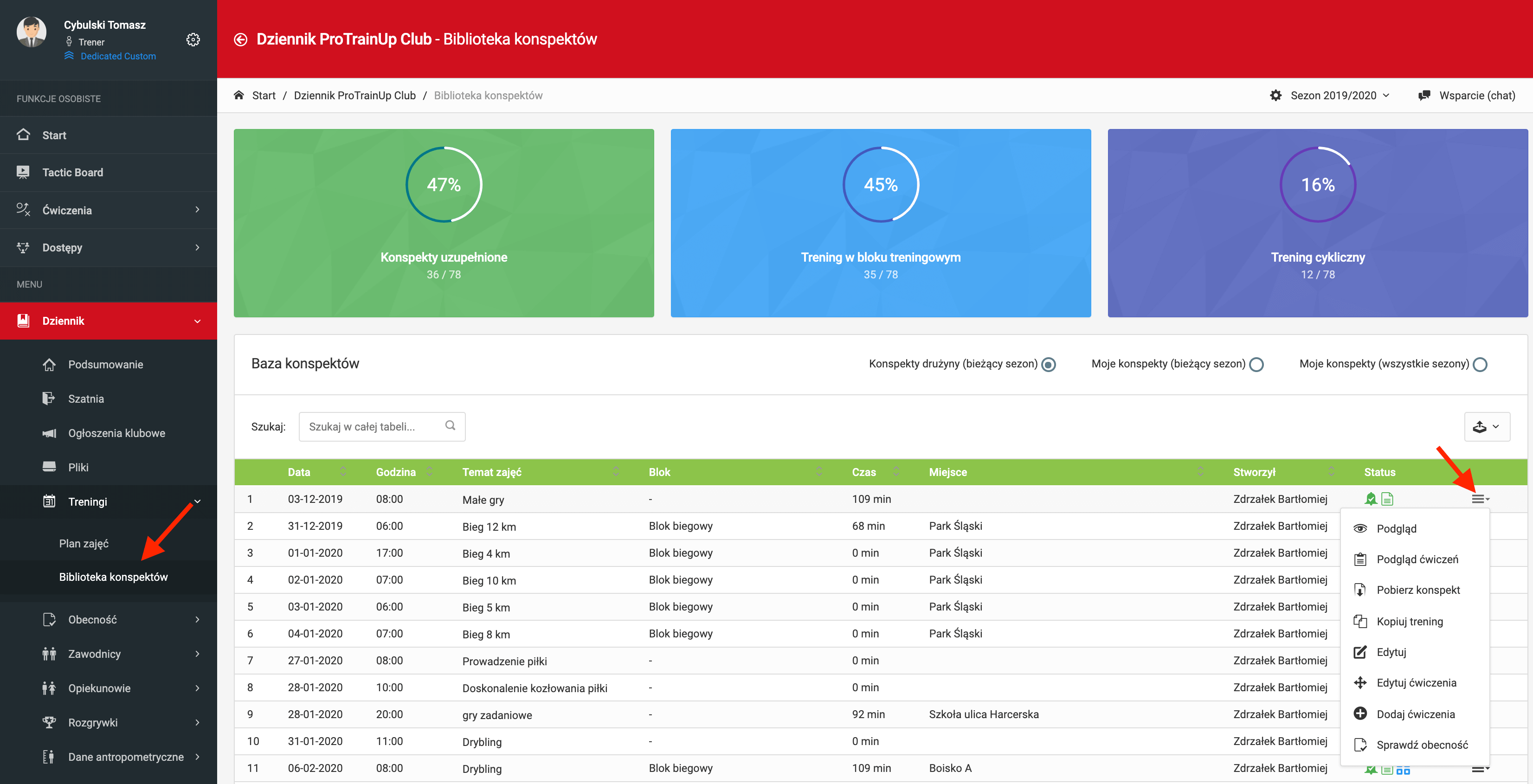 Każda drużyna, w zakładce dziennik treningi biblioteka konspektów ma swoją indywidualną bazę wszystkich przeprowadzonych treningów wraz z konspektami. Dzięki temu będziesz dokładnie wiedział co z daną drużyną było robione na przestrzeni wszystkich sezonów. Z tego też miejsca będziesz mógł m.in. kopiować wcześniej przygotowane konspekty.